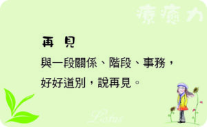 Lotus話心靈 最近有沒有這樣的狀況可能對一份工作厭倦了,可能對一段感情覺得走不下去了,也可能突然對某一件熱衷的事情失去了熱誠,也可能會有突然需要轉換環境…… 移動到更適合自己的地方2022能量變遷,快速顯化,每一個變動,都是為了移動到更適合自己振動的能量。當要告別一段關係、工作、事物(務)時,好好的獻上祝福說再見。生命就像讀書升級,人與人,人與環境,人與工作、興趣、喜好,都是”短暫”的陪伴、聚首,當緣分盡了,責任了了,任務完成了,就要往下一站前進,各奔東西,這時好的說再見非常重要。 鞠躬再見,再見幸福想像對方(人、事、務)就在你前面,對他深深的鞠躬:「謝謝你的陪伴,深深感恩,深深祝福」抬起頭來:「現在我要往下一站前進,如果你願意祝福我,我會很感恩。」深深鞠躬:「我帶著你給的祝福,再見,期待再一次相見」轉身面向新的方向躍進。 <3 好好說再見,進入下一個幸福,再見幸福 <3 Category: Lotus話心靈Post navigationPreviousPrevious post:愛,是什麼?NextNext post:揚升の力量延伸閱讀心智圖,心の抒發2025/05/26「太棒了」轉換振動頻率2023/10/30你才是自己的「負」能量2022/06/10心靈 語言 and 迷失2022/05/16擁抱2022/03/25印痕是真,時間是假2022/03/25